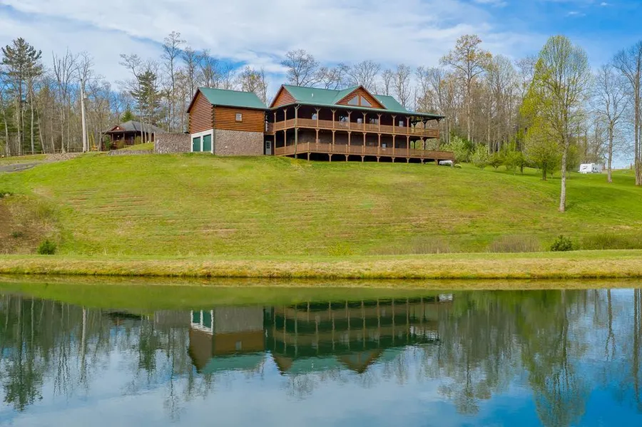 Enjoy this custom built log home in a park like setting located just minutes from the Blue Ridge Parkway. A large wrap around deck on the main level & a massive, 18' X 82' deck on the lower level allows you to enjoy a breathtaking view of your 11.3 acres. Picture a private 1 acre, stocked pond with a dock sitting between bubbling creeks that stream throughout the property. Now upon entering the home where you are greeted by an open floor plan with cathedral ceilings giving access to the kitchen, dining, living room & office/den. On each side of the great room are nearly identical master suites complete with walk-in closets, full bathroom with jet tubs & separate showers. Downstairs is an entire separate living area with its own living room, full kitchen, laundry room, 2 bedrooms, full bathroom and large storage room. There is a full 2 car garage on both the main level and lower level. Built by a contractor & the quality of construction is second to none.