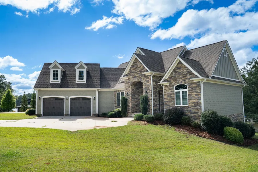This waterfront home is special. Newer style home with formal entry way. Hardwood floors with a floor to ceiling fireplace. Overlooks the lake from not one but two porches that are screened in with fans. The main level of this home features a large primary with trey ceilings and has his and her walk-in closets. A primary bath oasis with glass, walk-in showers, soaking tub, double vanity is an absolute stunning retreat in your very own home. Spectacular open kitchen with high-end appliances and marble countertops with glass backsplash what an amazing chef‘s kitchen. Office at the front of the house with its own full bathroom. Down the hall you will find a walk-in pantry complete with shelves for food storage. Also on the same hall, you will find a laundry room with a sink and extra cabinetry. Home features a double garage. Kitchen has a breakfast nook that leads to the porch for your morning coffee. The den opens with all the windows to a screen porch overlooking the lake and sunsets. Such a grand home. On the lower floor, you have two bedrooms, bath, and a den. Walk out basement to the lake with a dock in place. Storage and utility room in basement behind the finished den where the mechanical room is located. Plus you get your own separate garage with two bay doors, one being oversize for a camper. That garage also has a half bath for convenience. Call today for your private tour of this lake front home.