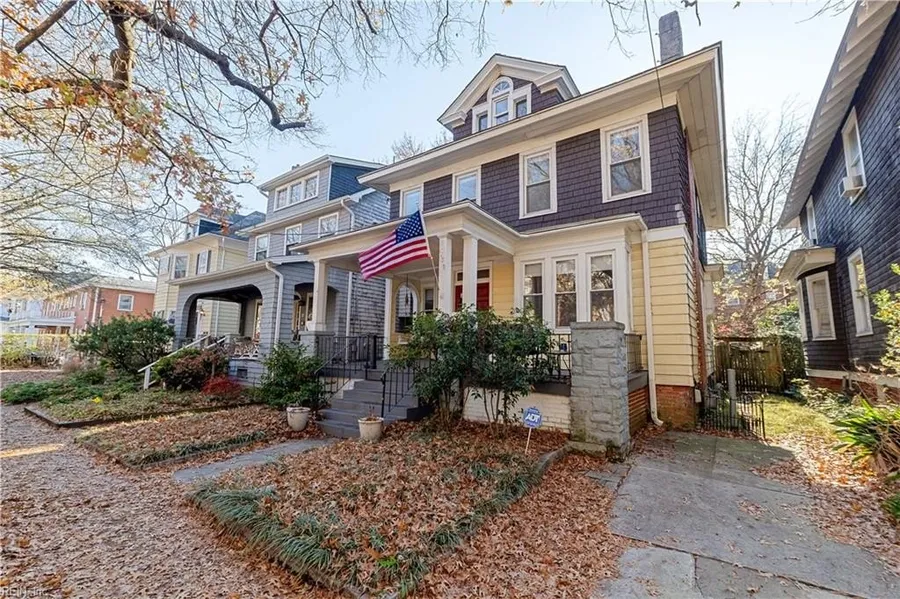 Beautifully located in the heart of Ghent, this early-1900s Colonial Revival offers classic charm, tall ceilings, great natural light, and over 2,400 sq ft of flexible living space. A bright foyer opens to spacious formal living and dining rooms with decorative fireplaces and hardwood floors. The main level includes a full bath and a well-sized kitchen with excellent layout potential. Upstairs features an expansive primary suite with its own bath and laundry closet, plus two additional bedrooms and a hall bath. The finished third floor adds a large bonus room or private 4th bedroom with walk-in closet. Enjoy the wide front porch, fully fenced backyard with patio and rainwater harvesting, and rare driveway parking. A new slate roof provides long-term value and timeless curb appeal. All just a block from vibrant Colley Ave—coffee shops, cafes, restaurants, breweries, parks, and everyday conveniences right at your doorstep.