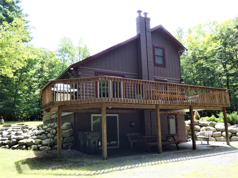 LAKE GEORGE, BOLTON LANDING -Well maintained log home nestled on 4.91 acres with private driveway. Knotty pine interior, vaulted ceiling, pellet stove @ LR, modern kitchen with dining area. Large wrap around deck, finished walkout basement with family room and sleeping (BR) and laundry. Carpet, harwood, tile. (Original plans show master on main level, conversion back with wall construction). Only 5 minutes to downtown Bolton.