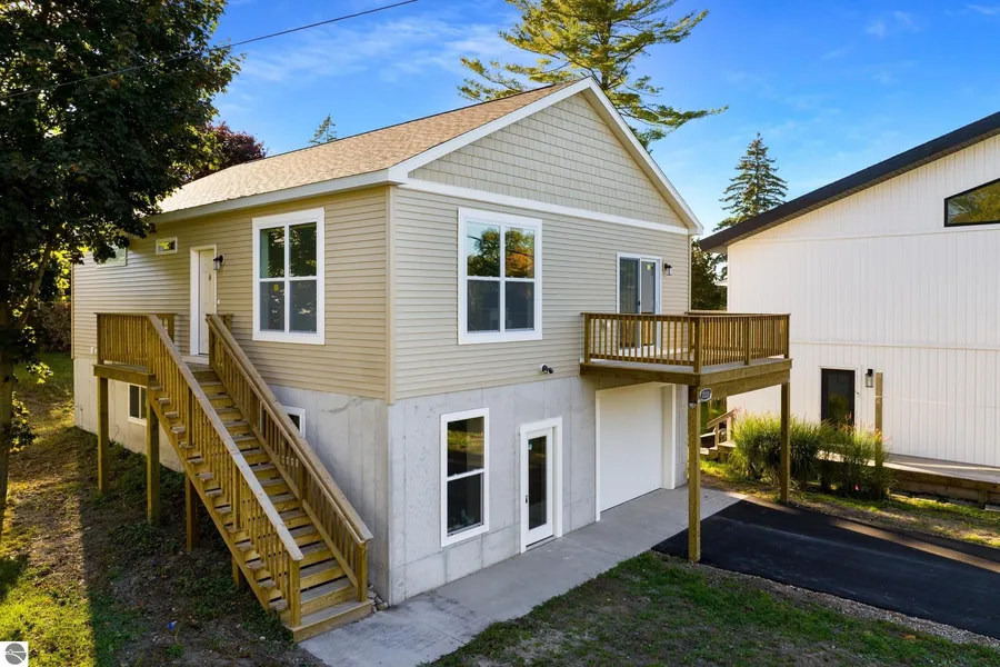 Enjoy the best of Beulah living, situated within 2 blks of Crystal Lake with a beautiful sandy beach, swimming, & boat launch. Fresh, modern new-build w/warranties included. Open concept upper main level living, w/9' ceilings & large windows providing park views & window treatments for privacy. 8'x16' deck just off the kitchen to enjoy the breeze & charm of the lakeside town. Lower level includes a large roughed-in & drywalled full bathroom, 3rd large bedroom & 2 additional living areas & garage. A getaway, rental opportunity or permanent home that is within walking distance to shopping, coffee shops, market, brewery, restaurants, basketball/tennis courts & trails.