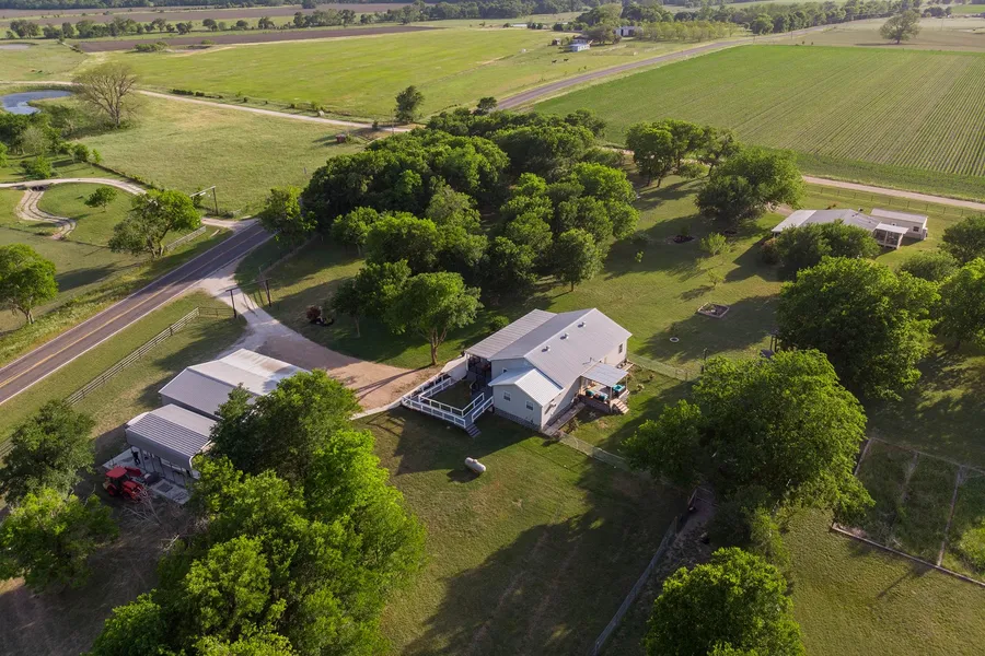 This property has everything that you need for your own farm. Secluded on almost 7 acres, this property features two ADA-compliant homes, with lush St. Augustine grass and beautiful, mature oak trees. The main home was fully renovated in 2019 including exterior siding. The exterior of the home features a wheelchair accessible ramp leading to the front door and a secondary entrance. The interior of the home features Lifeproof-brand wood floors and beadboard ceiling throughout the home. An electric fireplace and an 86" flat-screen TV custom mounted into the wall of the living room. The dining area features a wall of custom made maple cabinets and as well as quartz countertops which create the perfect environment for entertaining. The kitchen ties the whole home together with a large island with seating, cabinets, slate backsplash and even more quartz countertops, SS Zline appliances, 6-burner range with grill, double ovens, and industrial range hood. Throughout the rest of the home; the flex room could serve as an office or game room. The laundry area is accessible through custom barn doors. The primary suite features a spa-like bath with quartz counter tops, rectangular double sinks, and a walk-in shower with tempered glass, river rock, and mosaic accents. The secondary bedrooms will fit a queen-sized bed, while the secondary bath includes a walk-in shower with luxury finishes. A covered patio with a wooded view and a 55" TV is off the dining room and opens into a fenced yard and dog run. The 2 bedroom, 2 bath guest home is a few yards away, perfect as a weekend retreat for guests or as additional living space for family members. The home features an open floor plan, walk-in pantry, laundry room, a one-car garage plus screened patio. The rustic barn includes 2 stalls with possibility for a third and has a small paddock plus a large pasture. And no farm is complete without a heavily insulated shop with A/C to keep cool on those hot Texas days.