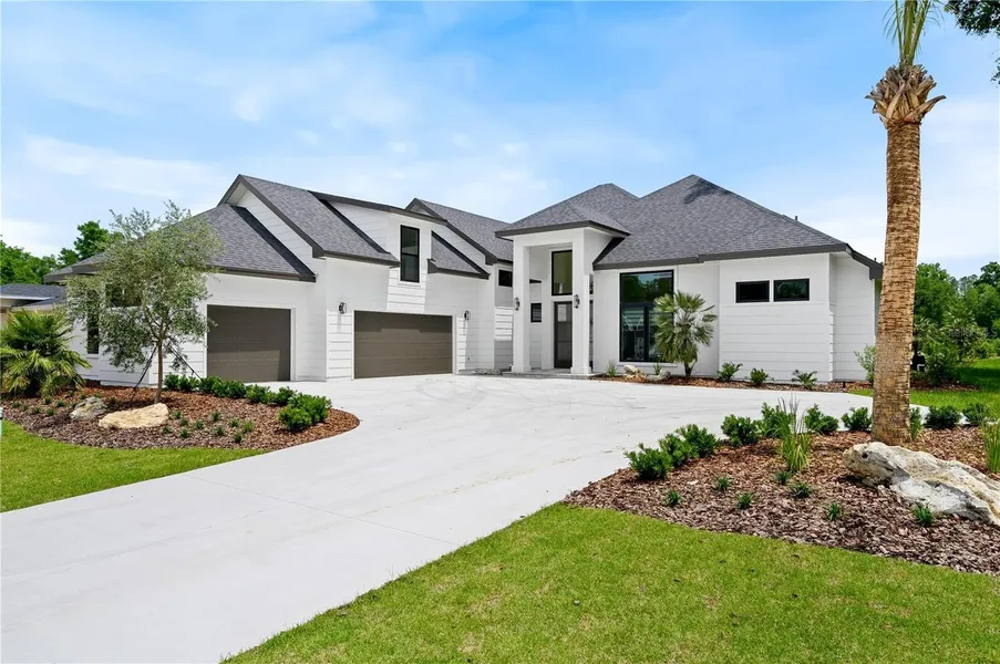Under Construction. Welcome to the Spain & Cooper Homes Spring 2025 PARADE HOME! This gorgeous brand new home features 4 bedrooms, 3.5 baths PLUS A BONUS & STUDY. It includes a Jack and Jill bathroom, a cabana-style en suite guest/pool bath, and an elegant master bathroom with separate vanities and a large double shower with an illuminated shower niche. The home has a coastal "West Indies" vibe with modern transitional touches, including hardwood floors in the main areas, upgraded carpet in the bedrooms, and custom tile designs in the bathrooms. A standout feature is the pool with a sun shelf as well as a large covered lanai with a wood ceiling accent. Inside, the home has soaring 12-16 foot ceilings, with a grand 16’ foyer, oversized Anderson windows, and a modern electric fireplace in the great room. The kitchen is designed with custom stained cabinetry, a large island, and top-tier GE Monogram appliances. Additional features include a wine wall in the dining room, a large butler’s pantry, a laundry room with a folding counter, and a study that provides extra natural light. The home is energy-efficient with a 3-zone Carrier AC unit, spray foam insulation, and tankless water heaters. The exterior boasts custom landscaping, with tropical plants and palm trees surrounding the property. Other notable features are a large concrete paver deck extending to the pool, custom sound and security wiring, and high-end finishes throughout, including decorative trim, baseboards, and doors.