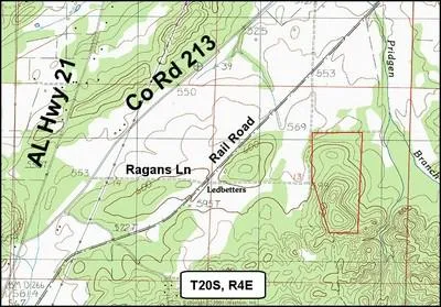 This property is located 45 min. from Birmingham near Childersburg and Hwy 280. A timberland property on a dead-end public road. Power available, a lagre green field, pretty hardwood timber, some planted pines.