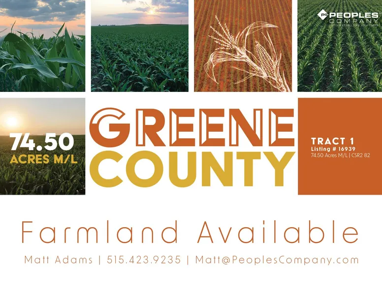 Greene County, Iowa Farmland Available- Peoples Company is pleased to present 74.5 acres m/l of prime Greene County, Iowa farmland. This tract is located on 310thStreet south of Jefferson, Iowa; north of Bagley, Iowa; and in Section 23 of Greenbrier Township. This 100% tillable farm consists of 74.73 FSA cropland acres with a CSR2 soil rating of 82, which compares to the Greene County average of 78.3. The primary soil types on the property include Canisteo clay loam, Clarion loam, and Nicollet loam.