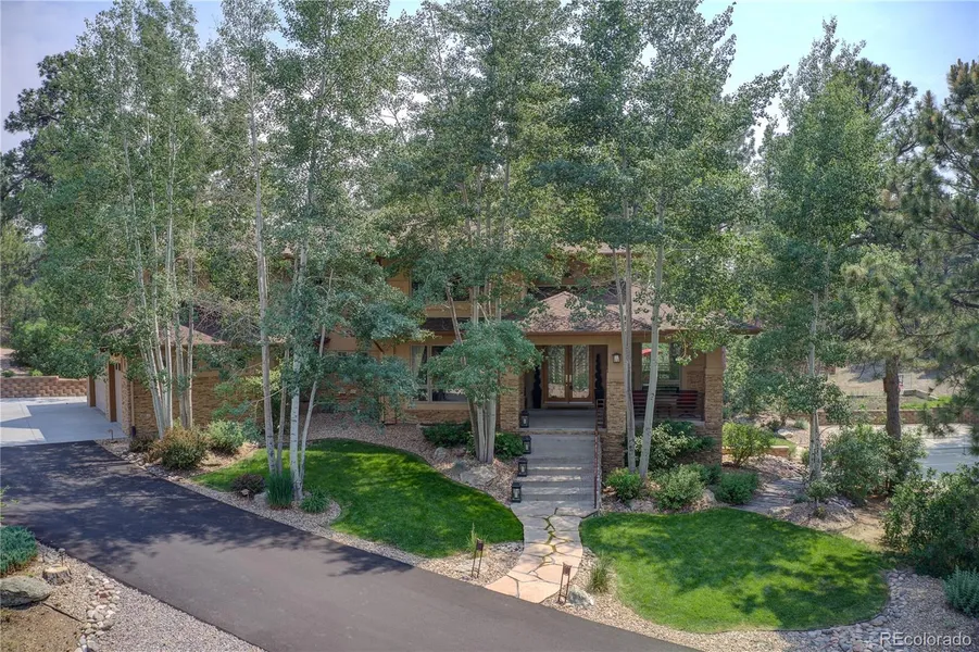 Privately tucked away in the pines surrounded by 4.5 acres and conveniently located between Castle Rock and Parker in Franktown. Come inside this beautiful "Frank Lloyd Wright" inspired two story and you are immediately welcomed to a wide-open layout with tons of windows and daylight. The main floor offers a large entertainers eat-in kitchen opening up to a large great room, formal dining room with butler's pantry and a main floor office with oversized windows allowing a lot of natural light. Upstairs offers a generous sized master suite complete with a walk-in closet, double sided fireplace and spa like master bathroom. Two additional oversized bedrooms share a bathroom and one additional bedroom with en-suite bath. Downstairs offers everything you need to entertain with a full bar, exercise room, guest suite complete with a full bathroom and an additional bedroom that can be used for a craft room or toy room. Sitting on the porch or the covered patio you will be surrounded by everything nature has to provide. If you need more room than the attached three-car garage, then you're in luck! The fully finished outbuilding is just over 1900 SQFT, fully insulated, with water and electricity. The building will fit any sized trailer, RV or boat you can think of. This is truly a car lover's dream. Please don't miss your opportunity at this gorgeous estate.