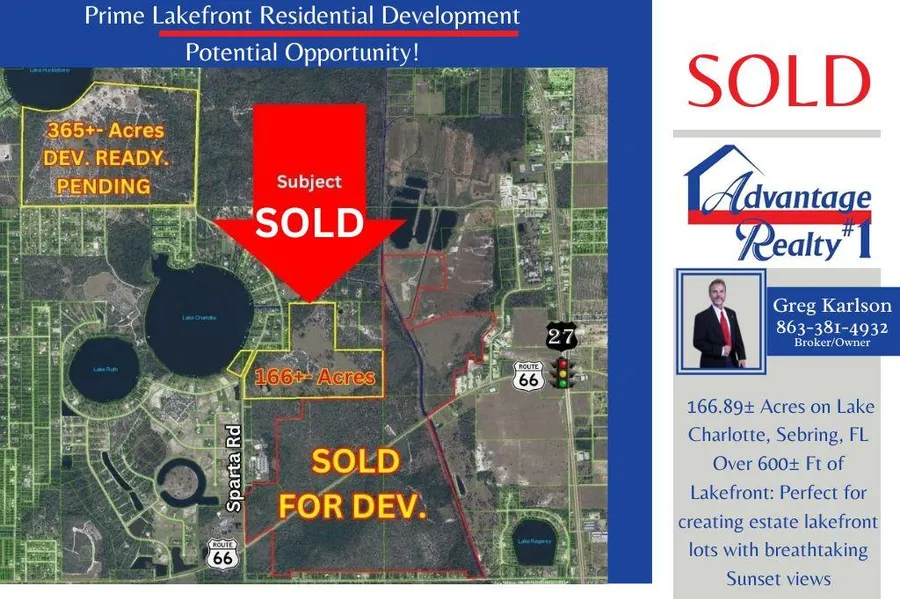 **SELLER'S FINANCING AVAILABLE** Prime Lakefront Residential Development Potential Opportunity! 166.89 Acres on Lake Charlotte, Sebring, FL Over 600 Ft of Lakefront: Perfect for creating estate lakefront lots with breathtaking Sunset views. Equal Paved Road Frontage on Sparta Rd: Offers easy access and high visibility. Zoning: Currently zoned Agricultural (Ag), but surrounded by residentially zoned properties with water and sewer access nearby, offering immense development flexibility.12inch central water line run along subject on east side of Sparta Rd w/ sewer line to the south of subject. Prime Location: Situated in the heart of Sebring's most valuable residential area. South: Adjacent residentially zoned property recently sold for development. North: Lake Huckleberry turnkey development site is under contract for $7.5 million. This site is ideal for estate lots or a thoughtfully planned residential community. With its central location and the growing demand for premium residential properties in the area, act quicklythis property is expected to sell fast! Potential Development Options: Buyers can explore rezoning opportunities aligned with adjacent residential properties or craft a custom development plan tailored to market need