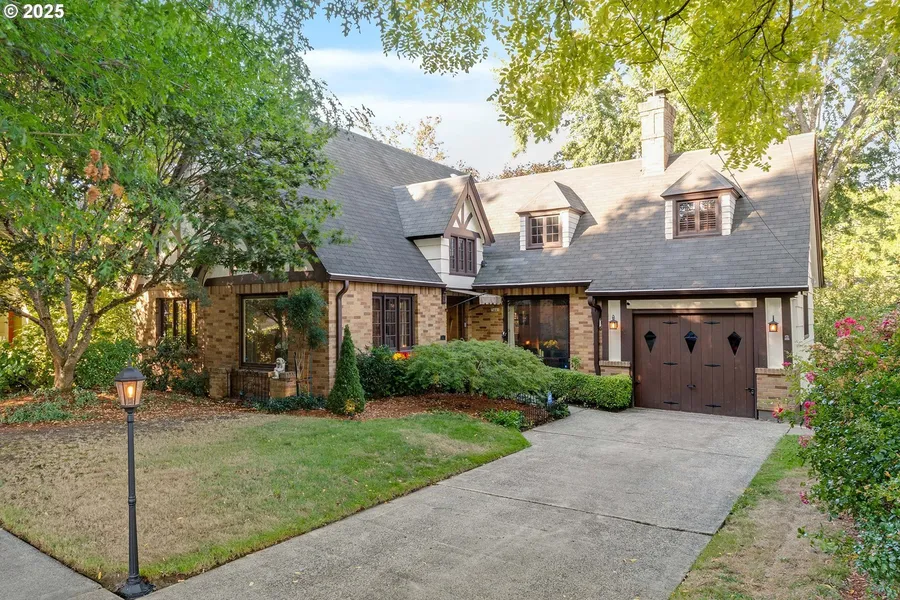 This storybook Eastmoreland Tudor Revival home, nestled on a picturesque tree-lined street in Portland, exudes character and charm at every turn. As you step inside, it feels as though you're entering the opening scene of a classic film, with a warm and inviting living room featuring a cozy fireplace and rich wood ceiling accents. The formal dining room radiates timeless charm, while the cheerful breakfast nook off the kitchen offers the perfect spot to enjoy morning coffee. The kitchen itself blends style and function with stainless steel appliances, complemented by new appliances installed in 2022. On the main level, a serene bedroom and beautifully updated full bath with a glass step-in shower provide comfort and convenience. The expansive basement adds a layer of versatility with multiple rooms ideal for a home office, wine cellar, pantry, or creative space, along with a spacious laundry area and direct access to the backyard patio. Upstairs, three additional bedrooms and a full bathroom complete the picture, offering both comfort and flexibility. Recent updates enhance the home's livability and appeal, including a new furnace and thermostat, new appliances (2022), and the exterior painted in 2022. This is a home where every detail tells a story-full of warmth, charm, and the enduring character that makes Tudor Revival architecture so beloved.