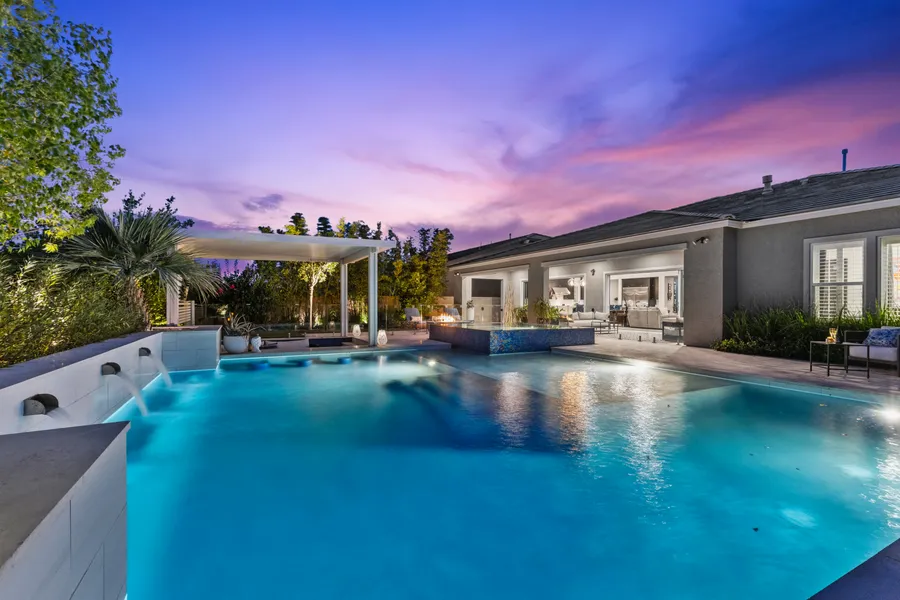 Step inside a masterpiece of modern luxury! Located by the heart of the highly desirable Skye Canyon community, this single-story estate is designed to impress. Spanning 3,450 sq ft on a massive, nearly quarter acre lot, this home is more than a residence—it's a destination. Prepare to be captivated by the grandeur of the living space, where soaring 15-foot ceilings create an atmosphere of pure elegance with custom-designed ceiling beams. The modern light fixtures and temperature-controlled wine cellar highlight the meticulous upgrades throughout. With four bedrooms, four bathrooms, and office/den, this home offers plenty of space. But the real showstopper is the backyard. This resort-style paradise features an oversized pool and spa, stunning sunken living room with TV, surrounded by lush, mature landscaping for ultimate privacy. Enjoy world-class amenities, including a community pool, fitness center, and clubhouse. Just minutes away from shopping, dining, and entertainment.