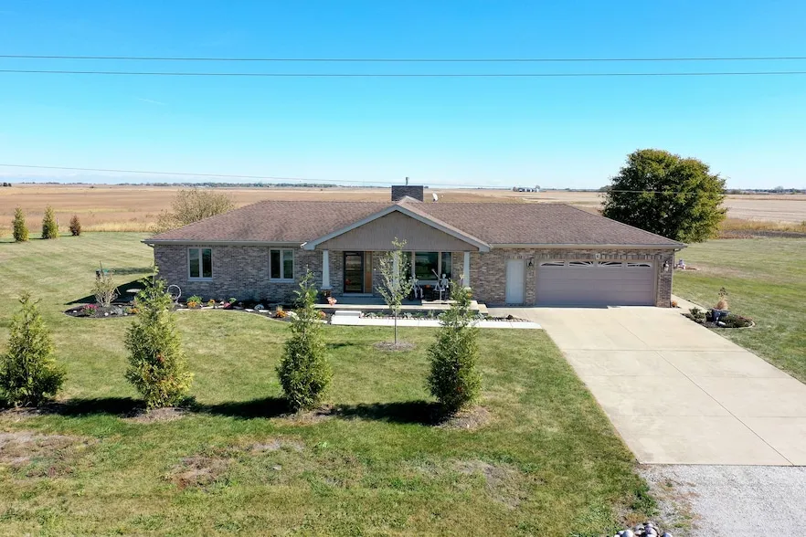 Nestled on 2 serene acres in rural St. Anne, this meticulously cared for all-brick ranch home offers both charm and quality construction. The inviting large front porch with new landscaping welcomes you into the 3-bedroom home, featuring solid oak doors and trim throughout. The spacious living room boasts a picture window that fills the space with natural light. The kitchen, complete with Amish cabinetry, granite countertops, stainless steel appliances, and a large island with seating, opens to the vaulted family room. Here, you'll find a gas fireplace, plenty of windows, and a door that leads to the covered back porch, perfect for enjoying peaceful country views. The patio furniture and dining room table are included. The home also features a convenient main floor laundry room. All bedrooms provide ample closet storage and share a generously sized full bath. The unfinished basement offers excellent storage, complete with included shelving. The home is equipped with a water softener system, whole house generator, and sump pump. The attached 2-car garage adds convenience. Additionally, the property features a 63x36x16 outbuilding with partial concrete flooring, set up for heat-ideal for a workshop or additional storage. This home is a true gem, blending modern amenities with rural tranquility.