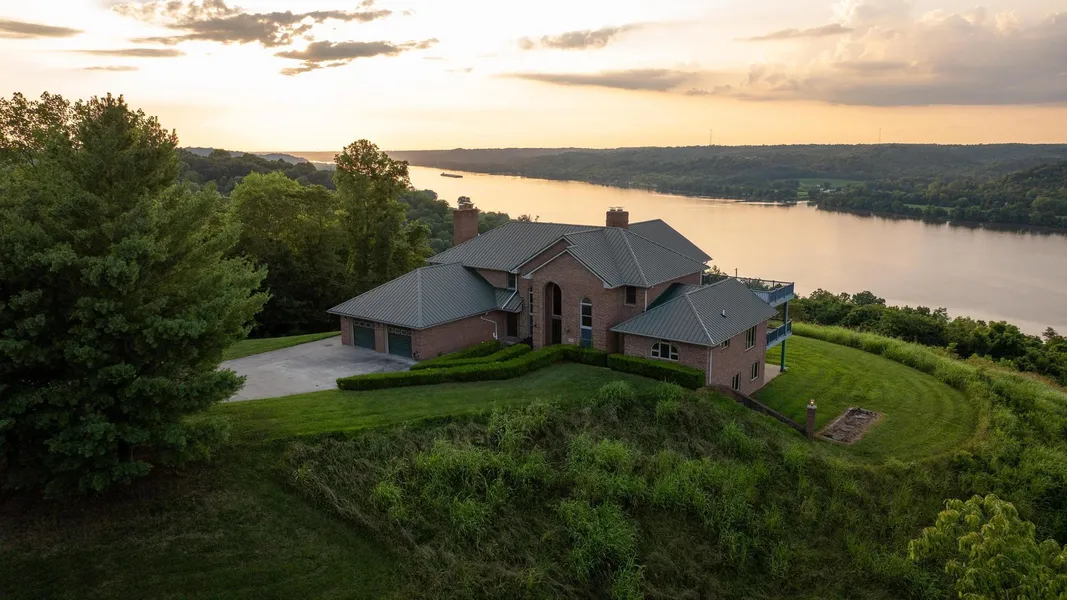 Where land and luxury meetthis stunning full-brick estate sits atop 75 acres with one of the best views of the Ohio River you'll find. Just 45 minutes from Cincinnati, the home is accessed by a private concrete driveway and offers 4 spacious bedrooms, each with its own en suite, and 3 with walk-out access to sweeping sunrise-to-sunset views. Enjoy a full entertainment basement, 2 laundry rooms, elevator to all 3 levels, and 4 wood-burning fireplaces. Outdoor living includes a three-tiered deck and full patio with river views from every level. The land is fully usableopen area plus wooded acreage full of timber and prime location for deer and turkey hunting. A large 2-car garage completes this rare opportunity to own a truly private, luxurious retreat that perfectly blends elegance, nature, and function!
