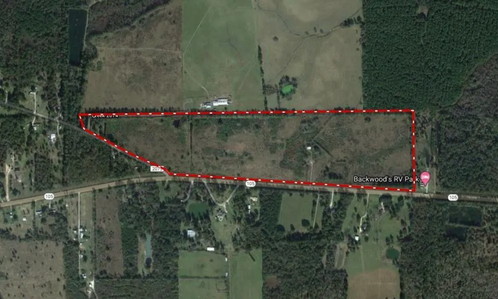Over 1/2 a mile of Hwy 105 frontage just over an hour from Downtown Houston. 1,100 sqft concrete floor barn onsite had previous construction begun for living quarters and never completed. Blank slate to now make it your own. This tract features 3 ponds and utilities available in multiple locations.