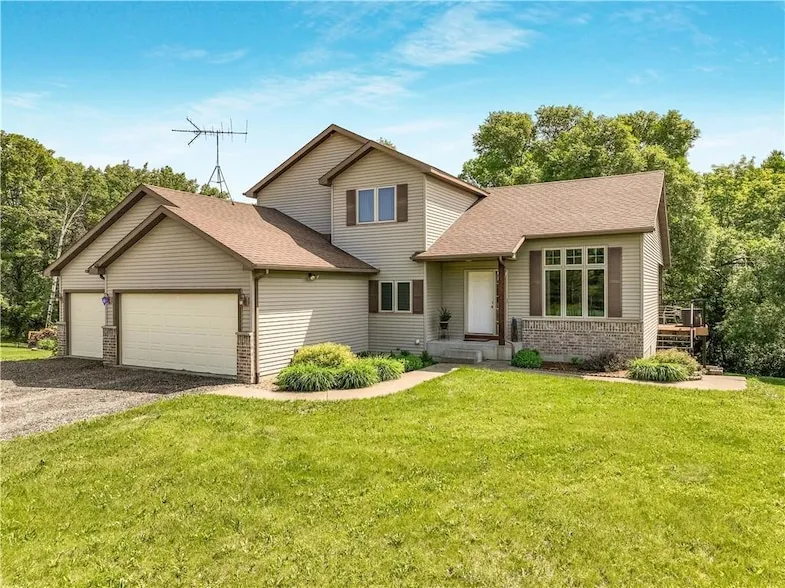Serene and spacious describe this Wis. 4 BR 3.5 BA home on 2+ acres! Lovingly placed on a hilltop surrounded by beautiful trees! Enjoy a pretty step-down living room with a gas fireplace, a large eat-in kitchen, a main-floor home office, and a 3-car attached garage. The spacious lower has a family room, a rec room, a bedroom, and a large bath w/soaking tub. The lower level features heated floors and is a walk-out to a private patio. Beautiful grounds that include a large garden and a 20x20 storage shed for all the extras. This original owner's home has been well cared for and is move-in condition. Live in the country yet enjoy the convenience of Hudson or River Falls, just 6mi to either downtown.