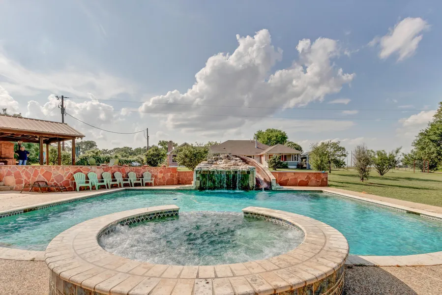 In the back yard is a custom in-ground swimming pool with waterfall grotto, water slide and an invisible edge hot tub built in 2012. Overlooking the pool is a cool tree house. Overlooking the pool is a large outdoor kitchen and BBQ party patio. The fully enclosed kitchen building has a concrete foundation and stamped and stained concrete floor inside. Wood framed, well insulated, and hardy plank siding with decorative rustic cedar plank siding on front exterior wall and all interior walls and a metal roof. Thick slab cedar countertops inside kitchen and on the exterior below a serve-thru window from the kitchen to the covered patio area. Authentic Amish wood cook stove inside with side hot water heater. Viking propane gas stove inside as well. All furnishings in outdoor kitchen can stay if desired (commercial cooler/fridge needs a relay switch). A large flagstone covered patio with ceiling fans and lights sits in front of kitchen with two built-in BBQ pits (large and small) and a large built-in smoker is behind the large BBQ pit. A wood fired large food dehydrator sits adjacent to the small BBQ pit.