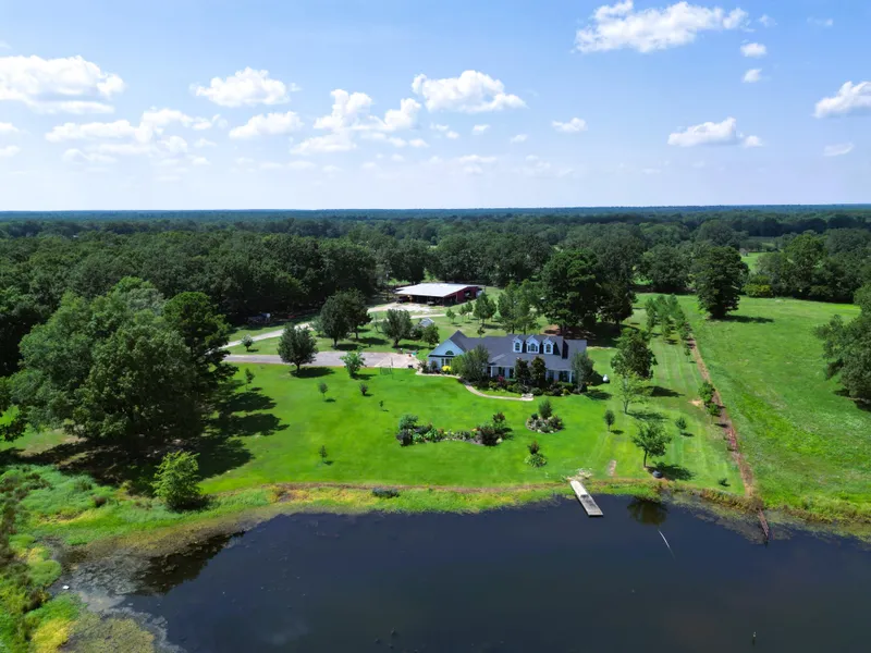 Porch: One of the best places to relax is the covered front porch with ceiling fans, colonial columns, and relaxing swing. Views are overlooking over a serene setting of lush landscaping with the bass lake and dock below.