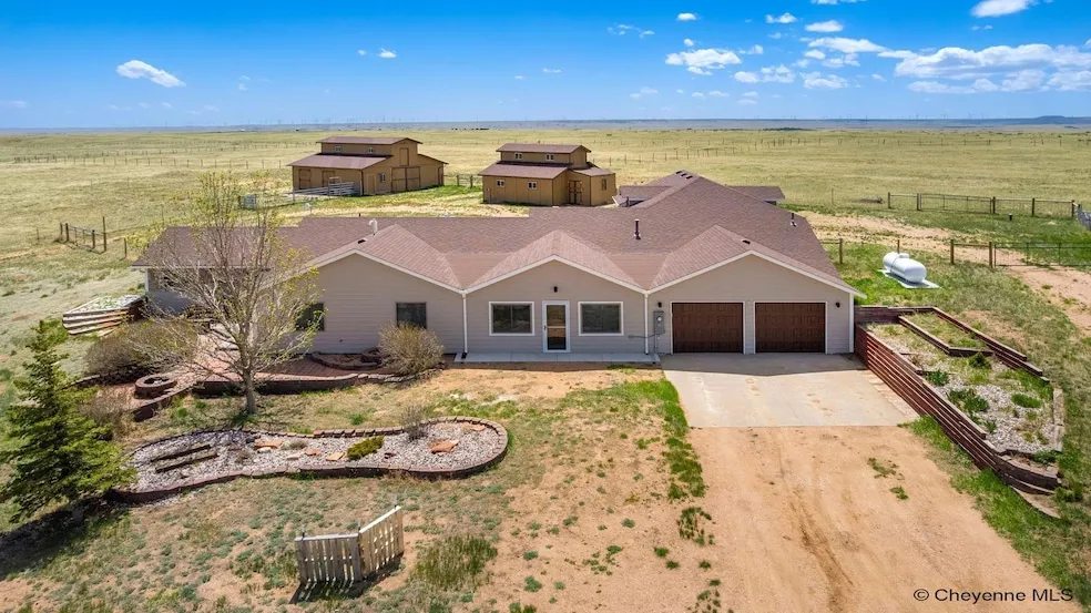 Nestled on 12.5 fenced acres with beautiful Wyoming views, this stunning 4-bed, 3-bath home offers exceptional updates throughout. The chef s kitchen features Viking appliances, large island, Quartzite counters and custom cabinetry. A spacious eat-in kitchen and formal dining room are perfect for entertaining. The large primary suite boasts a walkout patio, a luxurious en-suite with a dual-head walk-in shower, marble flooring, a soaker tub, and a walk-in closet. New Renewal by Anderson windows provide natural light, while a sunroom and office space add additional functionality. The attached 2-car garage, barn with hayloft, and outbuilding with additional car spaces provide ample storage and workspace. A perfect blend of comfort and country living!
