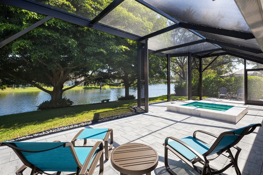 A serene lakefront setting is the backdrop to this timelessly charming home in Monterey, with a fabulous design package by award-winning Sand Dollar recipient Jinx McDonald. Southeastern sparkling lake views with gorgeous landscaping provide you with your private oasis. Offering a newer (2022) marble spa, picture frame screen and beautiful pavers, the outdoor space is done to perfection. The home sits on a quiet lot and boasts an open great room floor plan, 12-foot ceilings, custom woodwork details on the ceiling in the breakfast nook and beautiful wood floors throughout the living area. Other improvements include a paver driveway, new roof in 2018, new HVAC in 2021 and new water heater in 2023, plantation shutters, crown molding and meticulous condition. Excellent layout with a lovely white kitchen with loads of bells and whistles, spacious breakfast room with fabulous custom dining table and built-in bench, and large covered area on lanai. Oversized study could easily be converted to a third bedroom. Monterey is an active, sought-after community less than three miles to the beach, Mercato and Waterside. Amenities include a 24-hour guarded gatehouse, renovated clubhouse, newer fitness center, billiards, heated lap pool, basketball and pickleball court, new play area, active tennis with a pro and three lighted Har-Tru tennis courts. A-rated public schools and three excellent private schools within three miles.
