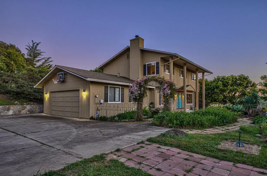 From majestic oak trees to mesmerizing sunsets this home and property exude tranquility. The rolling 2.54 acres Provide privacy and a peaceful quiet setting w/ space for gardening & outdoor enjoyment. Lovely xeriscape landscaping & the sound of gently cascading water welcome you and your guests to the front door. Large dual pane windows fill the home w/ natural light & frame the beautiful surroundings. Hardwood flooring throughout the living, family and dining rooms, w/ Saltillo tile in the kitchen & bathroom completing the open flowing downstairs living space. You're sure to enjoy the space efficient kitchen w/ plenty of counter space, newer stainless-steel gas oven range and dishwasher and, kitchen island with chopping block top. Completing this home is the second story where you will find a large primary suite complete with a balcony offering lovely views, including a distant peek of Monterey Bay, and the perfect spot for a quiet evening of star gazing. Three additional generous sized bedrooms and a full bathroom complete the upstairs. Ideally located near local shopping, services and eateries w/ easy highway access & +/- 30 minutes to beaches, wine tasting, hiking or biking trails & all the Monterey Peninsula has to offer!