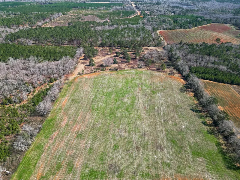 The remaining +/- 35 acres consists of a mix of pine and hardwood forest, offering ideal conditions for hunting and outdoor activities. Long Branch, a creek that runs along the southern property boundary, provides year-round water sources for wildlife. Deer, turkey, small game, and dove are abundant and commonly seen while visiting. New hunting stands and feeders are included.