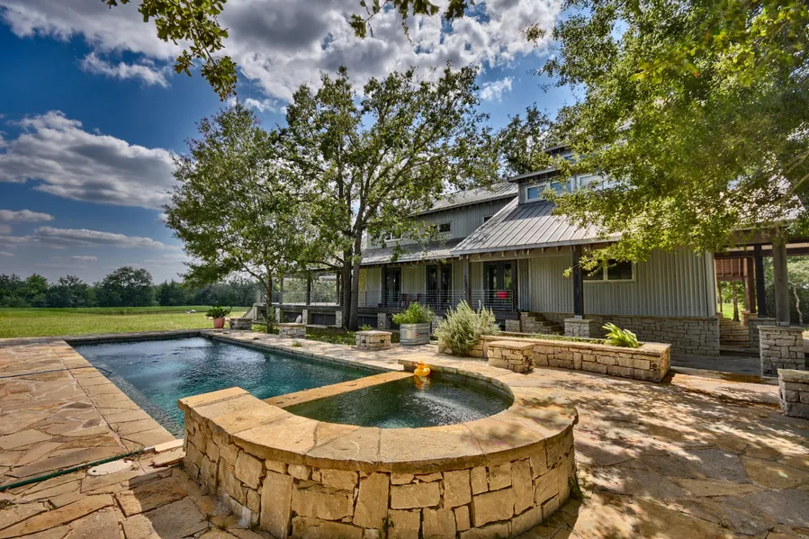 The Ranch features a unique 2,388 sqft 3b/3b custom built 2 story Farm House nestled in a nice meadow at the rear of the property overlooking a beautiful pond stocked with bass. As you enter the main home you will notice the low maintenance galvanized and limestone exterior with 2,664 sqft of porches to take in all the views, and a custom pool built up on a limestone foundation for those hot summer days. Inside you will find a open floor plan with Vaulted ceilings, exposed trusses, limestone fireplace, wood floors and double kitchens for entertaining. The galvanized staircase will take you upstairs to the 3 bedrooms and 2 bathrooms, the master bedroom has many windows that gives you the feeling of being outside with a balcony to sit and relax. Down the hall the second bedroom has bunkbeds and the third bedroom is being used as a office.