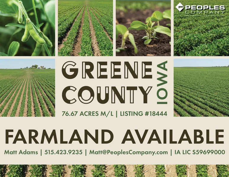 Greene County, Iowa Farmland Available - Peoples Company is pleased to present 76.67 acres m/l of prime Greene County, Iowa farmland. This tract is located on County Highway E57 south of Jefferson, Iowa; immediately west of Cooper, Iowa; and in Section 16 of Franklin Township. This nearly 100% tillable farm consists of 75.53 FSA cropland acres with a CSR2 soil rating of 84.8, which compares to the Greene County average of 78.3. The primary soil types on the property include Canisteo clay loam, Clarion loam, and Nicollet loam.