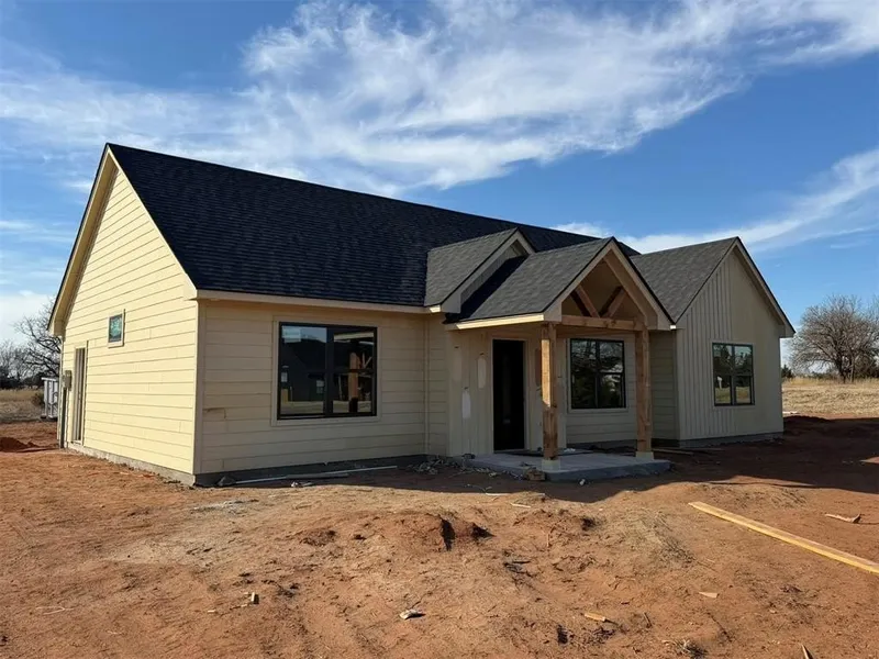 Welcome to country living with modern comfort! This brand-new Wilson Homes build sits on a peaceful 0.76-acre lot surrounded by Oklahoma's open skies and quiet backroads. The thoughtfully designed floor plan offers 1,425 sq ft of living space, featuring 3 bedrooms and 2 bathrooms with a bright, open layout that feels both spacious and cozy. The living area boasts a vaulted ceiling and large windows that flood the space with natural light, while the kitchen impresses with custom cabinetry, stainless steel appliances, and a generous island perfect for family gatherings. The primary suite includes a tray ceiling, walk-in closet, and a beautiful private bath with dual sinks and modern finishes. Enjoy morning coffee or evening sunsets on the covered front and back porches, surrounded by quiet country charm. With a two-car garage, durable board-and-batten exterior, and Wilson Homes' signature attention to detail, this home blends timeless style with rural tranquility. Located just outside Guthrie, this property offers the perfect mix of seclusion and convenience-ideal for anyone craving space, simplicity, and a touch of country living.