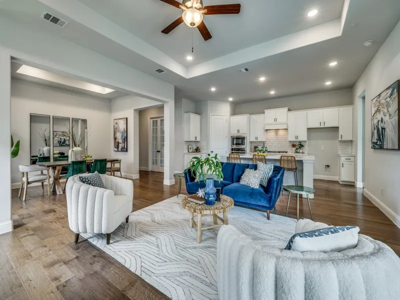 Gorgeous Taylor Morrison One-Story Home in Waterford Point at The Tribute. A spacious dedicated office makes working from home a breeze This 3-bedroom, 2-bath home offers outstanding value and lifestyle!! This spectacular home is simply perfect for entertaining. The kitchen is a true highlight with an extensive island that doubles as another eating space. The quartz countertops, lg. ss sink making this space truly special. The kitchen has a gas cooktop and walk in pantry. The large primary bedroom has a wall of windows overlooking the beautiful flower beds along the perimeter of the backyard. The primary ensuite is luxurious with a spa like feel to it and feeds into the huge primary closet. The main living areas have tray ceilings along with wood style flooring continuous through out all the living areas. The turf covered backyard is low to no maintenance. Step outside to your private backyard featuring a large extended covered patio with fireplace, surrounded by lush landscaping-ideal for al fresco dining and relaxing under the Texas sky. Residents enjoy exclusive access to resort-style amenities including a state-of-the-art clubhouse and pool, scenic lakeside trails, a championship golf course, and a new marina coming in 2026. All of this, just minutes from upscale shopping, dining, and entertainment. Don't miss the opportunity to make this exceptional home your own and enjoy the ultimate in comfort, community, and luxury living. Truly a MUST see!!