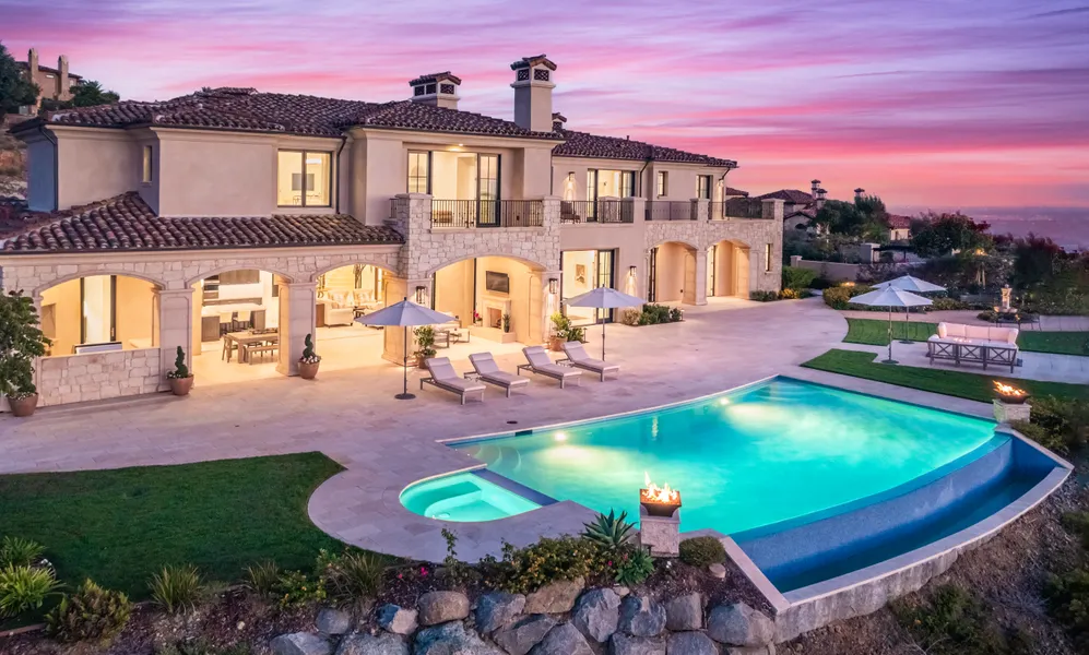 Nestled in the exclusive, guard-gated community of Cielo, this exceptional custom-built estate offers truly jaw dropping views spanning the Pacific ocean coastline & Eastern mountain hillsides. Situated behind automated, private gates atop a 2.39 acre lot, this modern masterpiece completed in 2018 offers an exceptional, open floor plan, spacious 6 car garage, private elevator & a true entertainer's dream backyard. With lush, perfectly manicured grounds offering covered loggia with fireplace, multiple fountains, fire pit, gardens, fruit grove, extraordinary infinity edge pool/spa with fire features, full outdoor kitchen with EVO grill & Lynx BBQ & more, this home was really built for year-round indoor/outdoor living. The entry level features vast views & an abundance of natural light from the moment you walk in. No expense was spared in the design & construction of this one-of-a-kind, smart home. Downstairs you will find a gorgeous great room framed by disappearing glass doors that open to the resort-style backyard amenitites. The 1st level also features an entertainer's pool table room with bar, 250-bottle onyx backlit wine cellar, gourmet kitchen with separate butler's kitchen, 2 ensuite bedrooms with private guest entry, stunning office/library & 2 separate garage bays with storage / gym space. Upstairs you will find the spacious master bedroom retreat complete with private balcony & beautifully finished "his" & "her" closets & bathrooms. There are 2 other en-suite guest bedrooms upstairs each with spacious deck space & forever views. This home is truly unlike anything else & offers incredible community amenities. Cielo residents can enjoy 24 hr security, two pools, two tennis courts, fitness center, basketball court, volleyball court, childrens climbing wall, picnic pavilion, play field at Cielo Park, and Club Cielo with multiple entertaining areas & a catering kitchen. Live the true Southern California lifestyle!