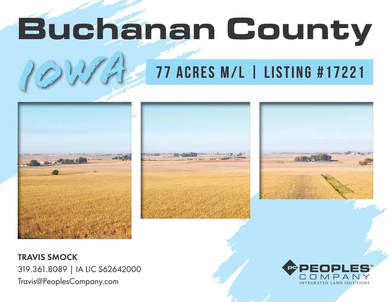 Presenting 77 acres m/l of high-quality Buchanan County, Iowa farmland located just south of Independence along Highway 150! This farm is considered 100% tillable with 77.23 FSA cropland acres m/l carrying an average CSR2 of 85.6. The main soil types are the high-producing Readlyn, Clyde, and Kenyon loams. This pattern-tiled farm is perfectly situated along Highway 150/Jamestown Avenue, just one mile south of US Highway 20, and offers easy highway access to multiple grain markets and ethanol plants. The property is considered Non-Highly Erodible Land (NHEL). The farm is located in Section 16 of Sumner Township, Buchanan County, Iowa.