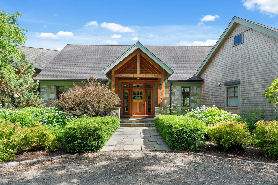 This elegant home is surrounded by bountiful gardens and acres of green serenity. This property is truly for those with discerning taste craving privacy and a natural setting. With over 139 acres, main house, barn with guest quarters, pond and hiking trails - this house leaves every box checked. The rugged but elegant exterior of the home gives the sense you are in mountain town, a blend of stone and cedar shingles. A dramatic entrance welcomes you into the foyer of the home. A breathtaking living room will leave you awestruck with the high ceilings, expansive space and natural light that streams in. Adding to the coziness of this room is a wood burning fireplace that will surely have guests surrounding it on a cold winter's evening. The built-in window seats make it easy to imagine settling in with a book on an Autumn afternoon. A home that makes entertaining easy, the living room leads into the dining room - sharing the high ceilings and hardwood floors. From there you can continue out to the expansive exterior stone patio or into the large kitchen. The kitchen features a continuation of the soaring ceilings, and all the best in kitchen finishes including a Subzero refrigerator, a Wolf six burner propane cooktop, expansive granite countertops for prep work doubling as an eating space and a large pantry.
