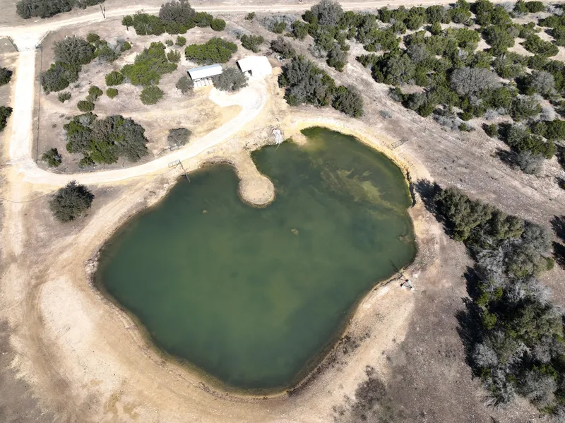 Separately fenced-in camp area overlooking large and deep 1.15-acre pond stocked with feeder minnows, large-mouthed bass, blue gill, channel catfish, and ducks. Constructed fishing pier