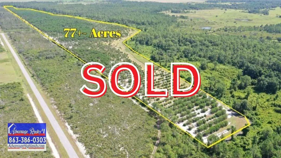 77.93+-acre Good Producing Citrus Grove Nestled in between State Conservation Lands to West & Large Ranches to East makes this Prime Wildlife area. Citrus grove produces 256 boxes per acre of early/mids with a large 12"well that waters entire grove at one time protecting it from freeze. Great soils allow adequate drainage yet hold moisture where needed. This citrus grove is magnet for all the surrounding wildlife to come to as it is the only food source of it's kind in the area for miles! Come enjoy the income of this one of a kind property while securing one of the finest hunting areas in Highlands Co. Or come build your dream home where you will have the ultimate privacy & any type of food you wish to grow!