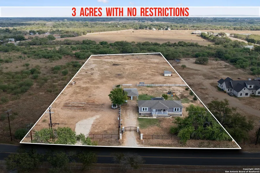 Welcome home to your beautifully renovated 3-bedroom, 2-bathroom home nestled on over 3 acres just outside San Antonio city limits. This property offers the perfect blend of country living and modern comfort. Step inside to find thoughtful upgrades throughout, including a spacious primary suite with a charming bay window and a spacious bathroom featuring a walk-in shower. The open layout creates a comfortable flow, ideal for both daily living and entertaining. Outside, enjoy a large covered and cemented patio perfect for relaxing evenings or weekend gatherings. The property also features a gated entrance, a 2-car covered addition, and a convenient shed for extra storage. With no restrictions, the land provides ample space for outdoor activities, gardening, or even keeping animals. Surrounded by quiet open skies yet still close to the city, this home is the perfect retreat for those seeking peace, privacy, and space to roam.