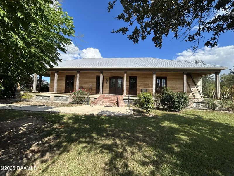 Experience the charm of a custom-designed / built, true Cajun Acadian throwback with modern comfort and elegance of this 4-bedroom, 3-bathroom set on 19.82 acres in Pine Prairie. This pier-and-beam home features a natural wood exterior, a wide wrap-around porch on three sides, and cedar walls and ceilings inside. Old-style farmhouse soul meets contemporary beauty throughout the interior.' With 3,470 square feet of living space, this property offers room to gather, relax, and enjoy the quiet surroundings. The heart of the home features a spacious kitchen with granite countertops and abundant cabinet space, flowing into a cozy living room complete with a unique river-stone fireplace, a large dining room, and a den with walls of windows and doors that bring in plenty of natural light. These inviting spaces are ideal for family time or entertaining guests. The primary bedroom offers an ensuite bathroom with a separate tub and shower. A second full bathroom also provides both a tub and shower, while the third provides both a guest restroom and also a bathroom for the adjacent bedroom (or office). Each bedroom has its own exterior door onto the wraparound porch, which provides a tranquil coffee, sunset, swinging and relaxing break with a view of the property where you can envision gardens, ponds, ball fields, play spaces, or anything you desire. The 700 ft carport leads to the 1600 ft garage paradise--a hobbyist's solution with a magnificent workshop area, multi-car parking, and custom shelving that solves many homeowner's space challenges. On the far side of the garage is a special partial garage for outdoor equipment, tractors, or other. And another separate 3rd covered carport area in the back.