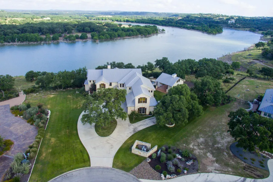 Waterfront Hill Country Gem with Breathtaking Scenic Views. This Canyon Lake estate with Guadalupe River frontage offers premiere exclusivity in The Peninsula at Mystic Shores. The oor plan includes dual master suites, large secondary bedrooms, a media room, exercise room and a guest suite with adjoining kitchen. This beautiful home is tied together by a stunning family room featuring Australian Cypress oors and a oor-to-ceiling stone replace. The chefs kitchen includes 4 ovens, 6 gas burners, 2 dishwashers, knotty alder cabinetry and gorgeous granite counters. A temperature-controlled wine cellar offers ideal storage for your favorite bottles and makes entertaining truly elite. With over 3,000 square-feet of covered porches, the outdoor living area is as delightful as the interior, with serene views of the Guadalupe river canal and Canyon Lake. A negative-edge pool and spa overlook the water for a truly relaxing experience. The 900 square-foot cabana offers additional covered living and includes a wet bar and full bath. Enjoy living on the water with nearly 2 acres in a gated subdivision and desirable proximity to San Antonio and the Texas Hill Country.