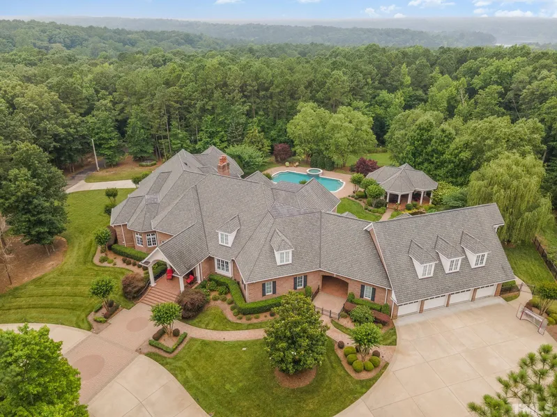 Sprawling estate featuring a breathtaking home situated on a total of 45 double gated and fenced acres! Includes a luxurious guest home (4610 sq ft) that will also enable you to keep your in-laws, parents, or children close by! The main home (8767 sq ft) is all brick and absolutely magnificent! Unique custom features throughout include reclaimed hardwoods, custom molding, radiant heat flooring, cedar closets, elevator, & so many more to list! Open the gorgeous solid wood transom French doors to be captivated by the 2 story marble foyer with pool view! Chefs will delight in the gourmet kitchen laden with custom Italian flooring while boasting Sub Zero cabinet faced built ins, Miele built in coffee station, steamer, convection oven, warming tray and induction cooktop! 2 dining rooms! Retreat to the primary for pool view and sitting room with fireplace with access to loggia! No expense was spared during the build of this Stephen Dilger beauty! Luscious landscape, loggia, large salt water pool, brick fire pit, spacious brick gazebo, & Koi pond accent the exterior! 9 garages total! Close to Falls Lake and park!