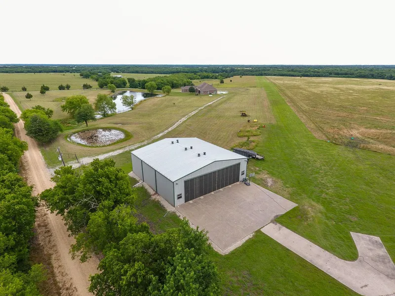 Unique and beautiful may be an understatement to describe this ranch in Hunt County, Texas near Greenville, and about an hour and 15 minutes from DFW airport. Approx 134 acres, pasture and timber, fenced, stock ponds, huge aircraft hangar, 2500 foot irrigated grass runway, and huge custom 5 BR-4 bath home on post tension slab on piers featuring a salt water pool & lovely views of a large lake. Wild game inhabit a creek area to complete the pleasures of life in the country. All set up for a flying family but not overdone in that regard. A well packaged creation of quality components for country living in tip-top condition for a new owner to occupy and enjoy upon arrival.
