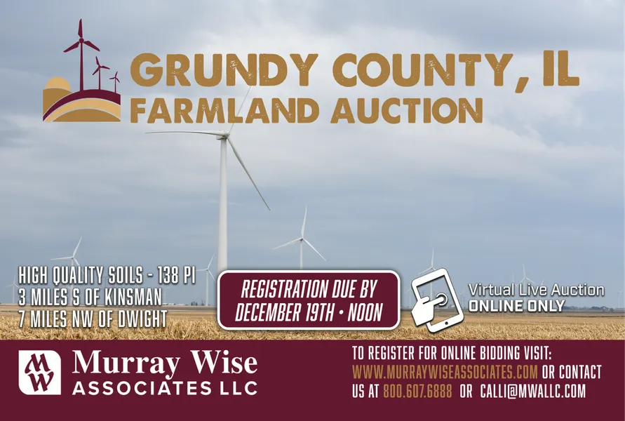 All bidders are required to register on Murray Wise Associates website on or before Noon CST on Monday, December 19, 2022. Once the online registration form is filled out it will be automatically sent to Murray Wise Associates for approval to allow bidding. Auction company may request a letter of recommendation from prospective bidders financial institution stating funds are available for the 10% deposit and that bidder has the financial capacity for final purchase.