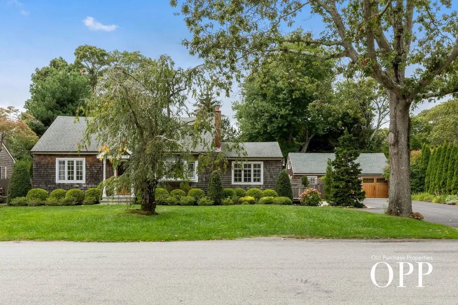 This cedar-shingled home offers three bedrooms, two and a half baths, and a layout designed for both everyday living and entertaining. The first floor includes a private primary suite with a full bath and access to a deck with its own outdoor shower. The living room, with soaring ceilings, exposed beams, and walls of windows, captures light throughout the day. Sliding glass doors lead directly outside, extending the space into the backyard for effortless entertaining. A spacious dining area, kitchen, and powder room complete the main level. Upstairs, two additional bedrooms and a full bath add flexibility. Outdoors, landscaped grounds create a private setting with a pergola for shaded dining, a sparkling in-ground pool, and a substantial outbuilding with endless possibilities. The property is ideally located close to downtown Bellport, offering easy access to the ferry to Ho-Hum Beach, country club for golf and tennis, shops, galleries, and dining.
