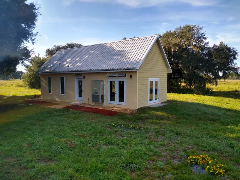LOCATION---LOCATION---LOCATION!! 5 acres surrounded by acres and acres of open land with scattered oaks. Just minutes from Super Walmart, I-75 Exit 314, restaurants, retail etc. Private road access. Studio style home with concrete block and metal roof construction. 200 amp electrical service with 200 amp double throw transfer switch for operating a generator. Tongue and groove cathedral ceiling. Casement and transom windows provide excellent air flow during nice weather. Large walk-in shower with glass block exterior accent wall for sun-glow during the day. Less than 30 minutes to The Villages area.