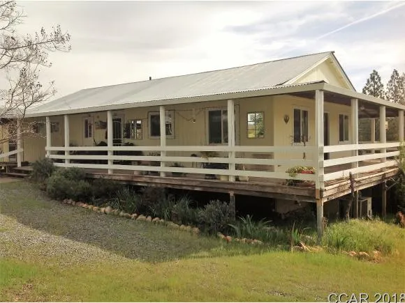 Come live in the country in this charming country home on 8.14 acres with covered wrap around porch on 3 sides, a barn, a spring fed pond, all fenced pastures & all just minutes from historic downtown Mountain Ranch. The house is inviting with an over-sized living room with knotty pine walls and beamed vaulted ceilings, a river rock hearth & wood stove. The kitchen cabinets all roll out for lots of storage, butcher block counter & the layout is perfect. Both bedrooms have a bathroom and the master has a walk-in closet & a slider takes you out to the covered deck. The 2nd bedroom has an additional large light-filled room that is perfect for an office or hobby room, or both, its that big. Property is being sold as-is.
