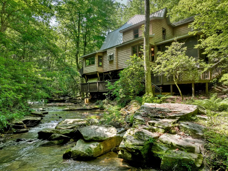 Welcome to one of North Georgia’s most remarkable private retreats — a rustic mountain compound tucked deep in the forest on over 43+/- acres of unspoiled natural beauty. Bordered by Harris Creek with its babbling runs, bold waterfalls, and serene swimming holes, this legacy property offers the ultimate in mountain seclusion and adventure. Anchoring the estate is a reimagined A-frame main house, thoughtfully redesigned to preserve its true-to-era rustic charm, while offering modern comfort and style. Perched above a dramatic bend in the roaring creek, the home boasts warm wood interiors, walls of glass, and generous decks to take in the tranquil sounds and sights of the water below. In total, the property features three distinct cabins and a large toy barn, offering 10 bedrooms and 6.5 baths, ideal for extended family gatherings, short-term rental potential, or an exclusive group retreat. Each structure blends seamlessly into the natural surroundings, with details like stone fireplaces, timber beams, and expansive porches. Adding to the one-of-a-kind experience is a professionally designed and maintained treetop canopy zipline course, weaving through the hardwoods with multiple platforms and soaring runs — your own private eco-adventure park. Complete with a spring-fed lake and dock, private trails, and endless exploration, this rare offering is a true mountain sanctuary — all just minutes from downtown Ellijay and Blue Ridge. A once-in-a-lifetime opportunity to own a legacy property that captures the spirit of the North Georgia Mountains.
