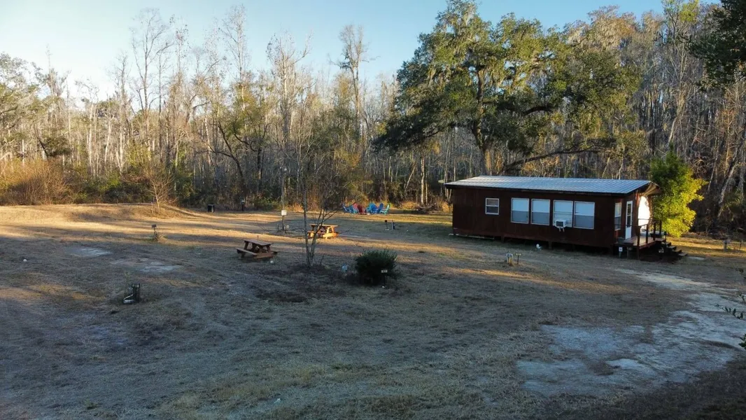 Registered RV campground with a move-in-ready 2BR/2BA home-ideal base for Steinhatchee fishing & scalloping or seasonal hunting. Set on quiet country acreage just south of Mayo and less than 3/4 of a mile off State Road 51, the cabin/home offers an open living area, full kitchen, two bedrooms, two baths, and practical storage. Two detached garages/workshops provide covered parking and gear space, and a vintage camper (currently used as a shed) conveys-great for storage now and a possible restoration project! Two gated entrances lead to a limestone main drive and limestone base for the RV sites with 8 full-hookup pads (power/water/septic-2x50A, 6x30A) plus 1 water & septic site (no electric). Designed for self-contained rigs (no bathhouse), the layout is low-maintenance and easy to run. Perimeter clearing and well-thought-out spacing make maneuvering simple, and Steinhatchee's Gulf access, scallop runs, and year-round fishing are an easy drive away-also popular with hunters seeking a clean basecamp. Campground registration in effect (docs available).