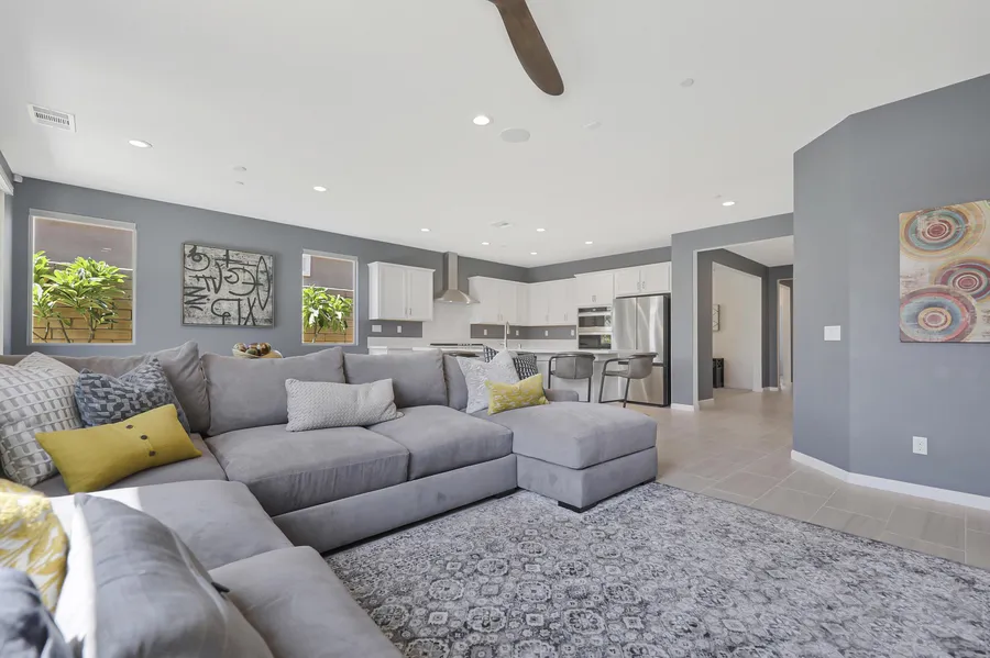 Innovative and Contemporary, this Comfortable Modern Design Features High Ceilings, Open Floor Plan, Light Porcelain Tile Floors, and Immaculate White Cabinetry and Countertops throughout. Gourmet Kitchen with Spacious Countertops, Upgraded Whirlpool Stainless Appliances, Island with Bar Seating and Pantry. Primary Bedroom with En-Suite Bath and Luxurious Oversized Walk-In Closet. Secondary Guest Room Privately Located away from Primary. This Popular Silver Creek Plan also features a Generous Sized Office which could easily be made into a Third Bedroom. Surround Sound and Motorized Shades in Great Room. Glass Sliders Open Great Room/Dining/Kitchen to Covered Patio-Perfect for Indoor Outdoor Entertaining with Family and Friends. Professionally Designed Backyard Landscape with Lighting and Irrigation. Owned Solar Panels. So many upgrades and Move-in Ready! Seize the Day and get into the Fun that this Community has to offer! Community Club House, Pool, Spa, Fitness, Pickle Ball and Bocce Court! Furnishings Negotiable outside of Escrow.