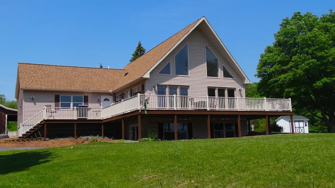 The panoramic views of the West Side of Cayuga lake in the popular Sheldrake sitting on the deck or in the living room are stunning and breathtaking. 110' of Shoreline with dock and boat hoist to enjoy. 2010 A Frame home with inviting open floor plan with views from every turn. Cathedral ceilings with a master bed/bath loft on the second floor. Mater bed/bath on main level. Newly, Full finished walkout basement with kitchenette and 2 beds/full bath for guests to have their own privacy Situated in the Heart of the Beautiful Fingerlakes where you are minutes away from Ithaca and wineries. SQARE FOOTAGE DOES NOT INCLUDE THE FULL FINISHED WALKOUT BASEMENT. THE ASSESSMENT CURRENTLY DOES NOT REFLECT WITH THE RESIDENTIAL HOUSE ON THE TAX RECORD