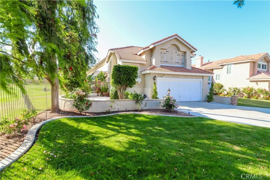 Welcome to your dream home in The Greens, an exclusive gated community nestled within the scenic Indian Hills Golf Club in Jurupa Valley. This stunning residence, extensively remodeled in 2019, is a perfect blend of modern luxury and timeless elegance. The main living areas feature beautiful hardwood floors, creating a warm and inviting ambiance from the entry throughout the home. Gorgeous travertine tile enhances the bathrooms and kitchen, adding a touch of sophistication. The heart of the home boasts light-colored cabinets paired with elegant quartz countertops. The standout copper farmhouse sink and top-of-the-line Samsung appliances (under 5 years old) complete this gourmet space. Consistent with the kitchen, all bathrooms feature copper sinks, light cabinets, and quartz countertops. The custom-tiled showers are a highlight, with the master bathroom offering dual shower heads for a spa-like experience. This luxurious retreat includes a walk-in closet with an organizer and a sliding glass door that opens to the backyard. Upstairs, you'll find two additional bedrooms and a full bathroom, all with plush carpet. The upstairs area offers views of the entire entry and family room, as it is open with just railings, adding to the home's spacious and airy feel. The home also features a new AC unit installed in 2019, ensuring comfort year-round. The professionally landscaped front yard features block walls, custom tile work, and lights, creating a grand and welcoming entrance. The spacious front porch offers an additional sitting area. Behind a beautiful custom wrought iron gate, this entertainer’s paradise features 180-degree views of the golf course and pond, perfect for sunset gazing. The outdoor kitchen is fully equipped with a pizza oven, wine cooler, refrigerator, copper sink, BBQ, and stylish countertops. Beautifully designed concrete patios with extensive lighting and uplighting create a magical evening atmosphere. Experience tranquility with views of the golf course, mature grapevines, and a variety of fruit trees including pomegranate, banana, and lemon. A striking 5-foot-tall fountain adds a calming water element, while torch lamps provide a dramatic fire effect. This home is a true gem, offering luxurious living in a prime location with breathtaking views and top-notch amenities. Don't miss the opportunity to make this exquisite property your own! For more information or to schedule a private tour, please contact us today.