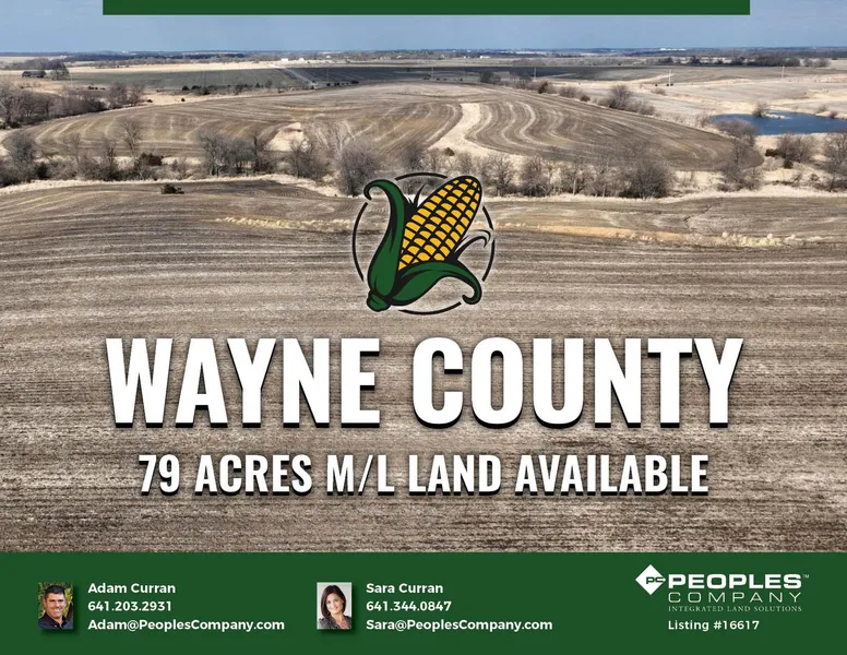 Located on the city limits of Corydon, Iowa this 79 acre m/l property offers a multitude of opportunities. With two entrances from the road, this property would offer multiple building sites for development with views of the rolling hills of southern Iowa. The property offers easy access to the major highways with its location just north of State HWY 2 and east of State HWY 14. Along with its prime location, this property offers good income production with approximately 60 acres in row crop production, offering a CSR2 of 47.8 on the tillable acres. This gently rolling farm boasts income, recreation, and potential for building to suit buyers need. It is truly a solid investment. The farm is located in Section 20 of Corydon Township in Wayne County, Iowa. The farm is leased for the 2023 crop season. Contact the listing agents for more details.