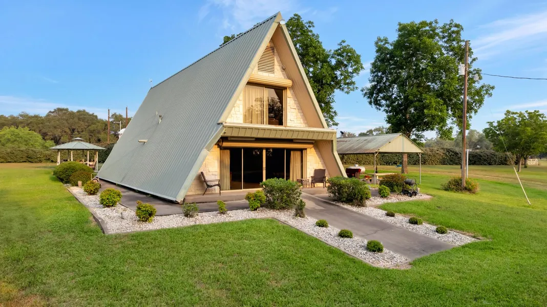 A Rare Find in Mission Valley! Nestled on 10 stunning, tree-covered acres in the serene countryside of Mission Valley, TX, this unique A-Frame style home offers the perfect blend of rustic charm and modern convenience. Step inside to discover a spacious 3-bedroom, 2-bath layout with an expansive open-concept living area, perfect for entertaining or relaxing in nature's embrace. The large island kitchen is a chef's dream, featuring granite countertops, double ovens, electric cooktop, built-in ice maker, dishwasher, and an abundance of storage. Throughout the home, you'll find beautiful rock accents that add natural warmth, along with an updated primary bath that boasts a tiled walk-in shower. The entire property is fenced and includes an electric gate for added security and privacy. Outdoors, enjoy a generous covered patio, a charming gazebo with an outdoor kitchen area, and a backup generator. For hobbyists or business owners, the huge metal workshop/garage is a standout feature complete with multiple sliding doors, two of which are electric. There's also a barn for additional storage or livestock. This rare property offers space, style, and function the perfect retreat for those seeking peace, privacy, and practicality.
