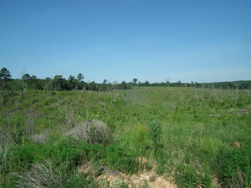 The property consists of 74 acres of one year replanted pines and 5 acres of bottomland hardwoods and is surrounded by timberlands. The terrain is hilly with a bottom suitable for constructing a lake with a ridgetop for Cabin construction overlooking the bottom.