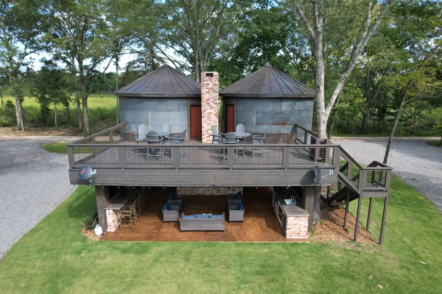 Upon entering the property, you will see two old grain silos, thus the name "The Silos Farm." Many years ago, this land was farmed as much of the land in the area was and these silos would have been used to store corn/soybeans or something similar. The current landowner saw these silos not as an eyesore but as an opportunity to create something very unique...a camphouse! Almost complete and totally transformed, the silos now feature 2 BR and 2 BA, a kitchen and living area, a huge upstairs deck, a massive outdoor brick fireplace and a covered outdoor kitchen with bar area. The silos are a perfect fit for this property and I will have to say one of the coolest ideas I've seen. You will not be disappointed with the view from the upstairs deck of a newly constructed pond complete with a covered dock and zipline. The pond has recently been stocked with bass and bream and offer great fishing fun for the whole family, the kids will love the zipline!